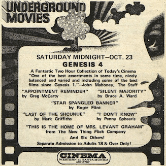Genesis Films, Ltd. was a curatorial/distribution project started in 1968 by a UCLA graduate named Reg Childs, to gather interesting student films into curated programs and tour them around the country. Although these programs showed in underground cinemas and other public venues, they were particularly marketed to university campuses.