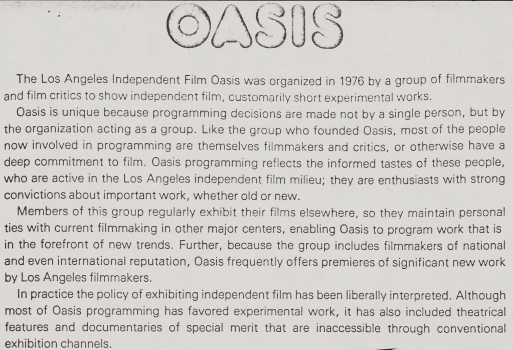 LAICA (Los Angeles Institute of Contemporary Art) existed between roughly 1974 and 1987, and hosted Oasis screenings in its space at 2020 S. Robertson Blvd.