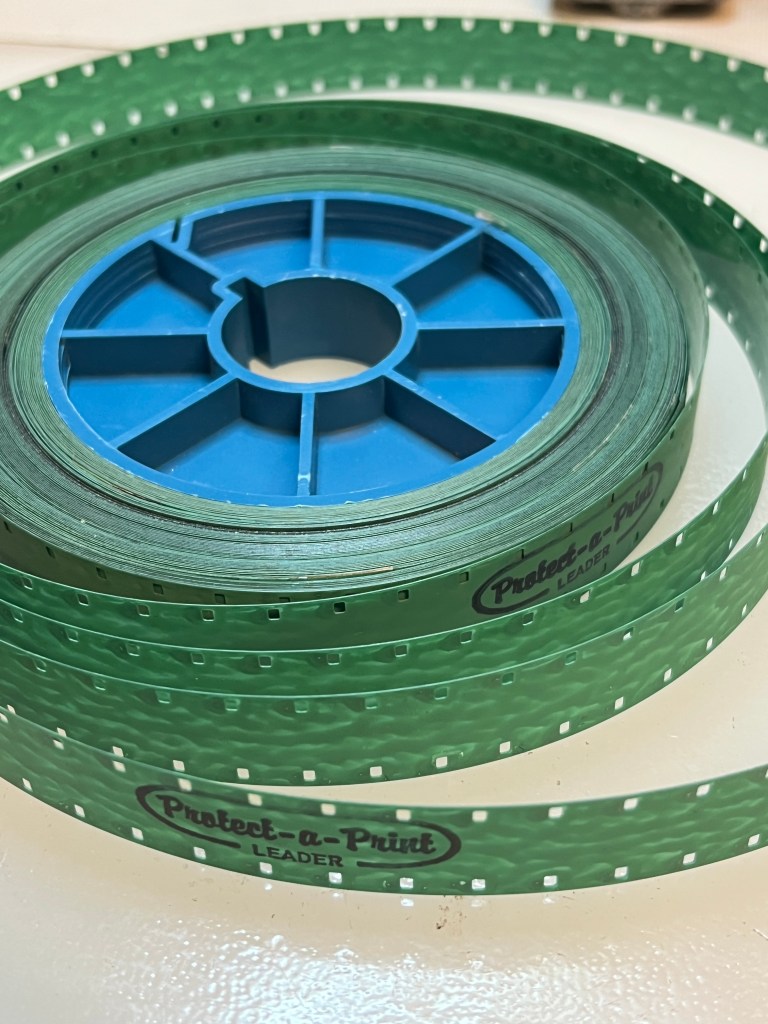 Many archivists have run into this stuff, especially if they’ve inspected prints originating from heavily circulated educational distributors, libraries, etc. The idea was that this especially thick plastic film – smooth on one side and textured and rough on the other – should be spliced to the head of a print, and when run through the projector it claims to help drag away stubborn bits of dirt, particles, and other bits and pieces of schmutz in the film gate and overall projector path that may risk scratching your print.