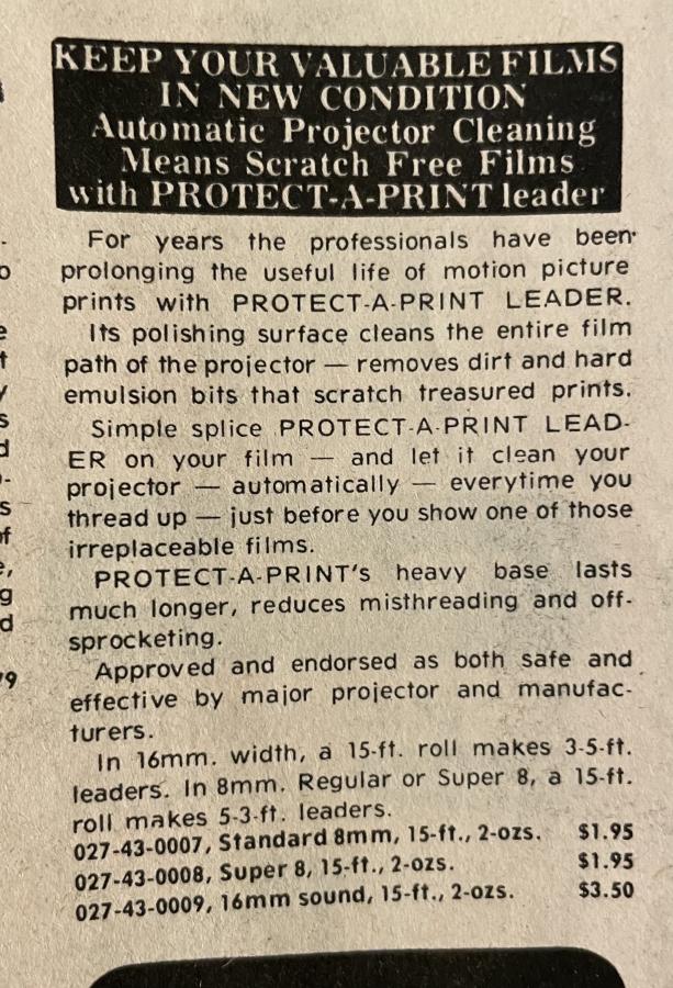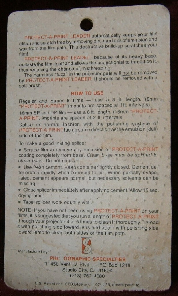 In principle it makes sense! And the simple fact that this product was produced for a few decades suggests that maybe it worked to some degree…? (Unless it’s attributable to the placebo effect!) I’ve also encountered several anecdotal comments from folks online and elsewhere that Protect-a-Print leader had the unfortunate side effect of wearing out or damaging the sound heads on people’s projectors. Eumigs in particular are cited online in a few places as being particularly sensitive victims. But purely as an archival artifact, I’ve for some reason always enjoyed the logo and look of this funny stuff.