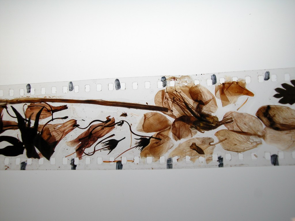 Brakhage produced the raw material for this film much like he did with Mothlight, by arranging organic matter (leaves, flowers, grass, etc.) between two layers of perforated 35mm splicing tape. In other words, the organic material was not affixed to film stock, but suspended in a sandwich of adhesive splicing tape. Two rolls were produced, the larger one labeled “The Garden of Earthly Delights” (comprising the material that makes up the middle of the finished film) and the smaller one labeled “Night Blooming” (comprising the material that makes up the beginning and end sections of the film). These rolls were each optically printed in various ways at Brakhage’s lab, Western Cine, to create the material that produced the finished film. The “Night Blooming” roll seems to have actually been created first, and the film originally may have been intended to have that title, and possibly even comprise only that material. In fact, the original material and the first generation optical negative made from it have a titlecard present (which was not retained in the final film):