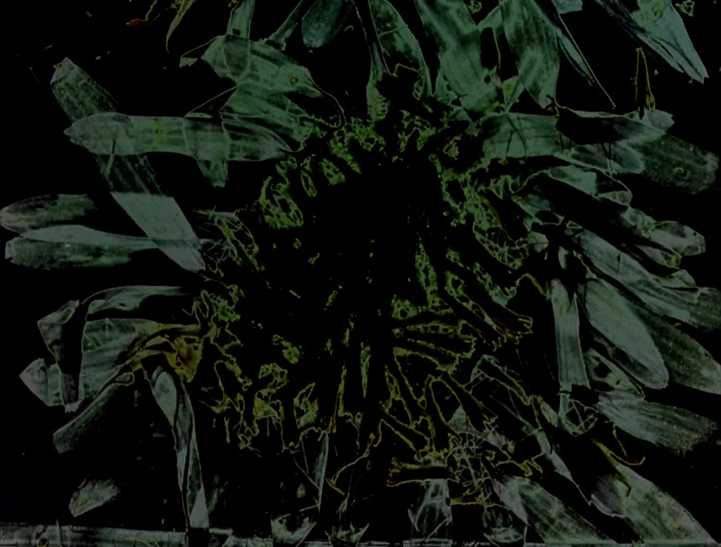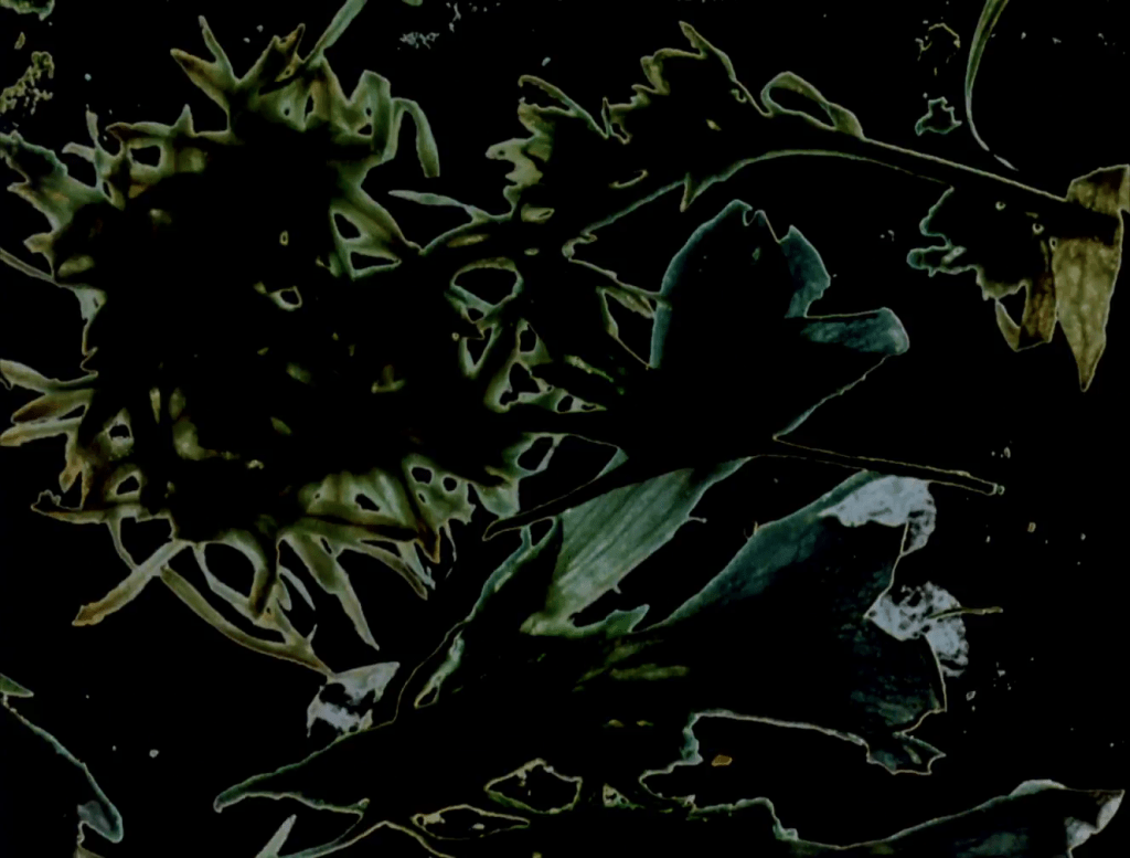 The appearance of the “Night Blooming” section that comprises the beginning and ending of the film is the result of a few steps of optical effects printing, in particular bi-packing a color positive and high contrast negative matte element (“bi-packing” refers to the physical sandwiching together of two film elements in the optical printer to then duplicate the result). As with the “Garden” sequence, the “Night Blooming” organic material was first optically duplicated to 5247 35mm color negative stock, which was then printed to 35mm 5381 color print stock. This color print was then printed to 35mm 5369 high contrast negative, essentially to create a negative hicon matte of the material: