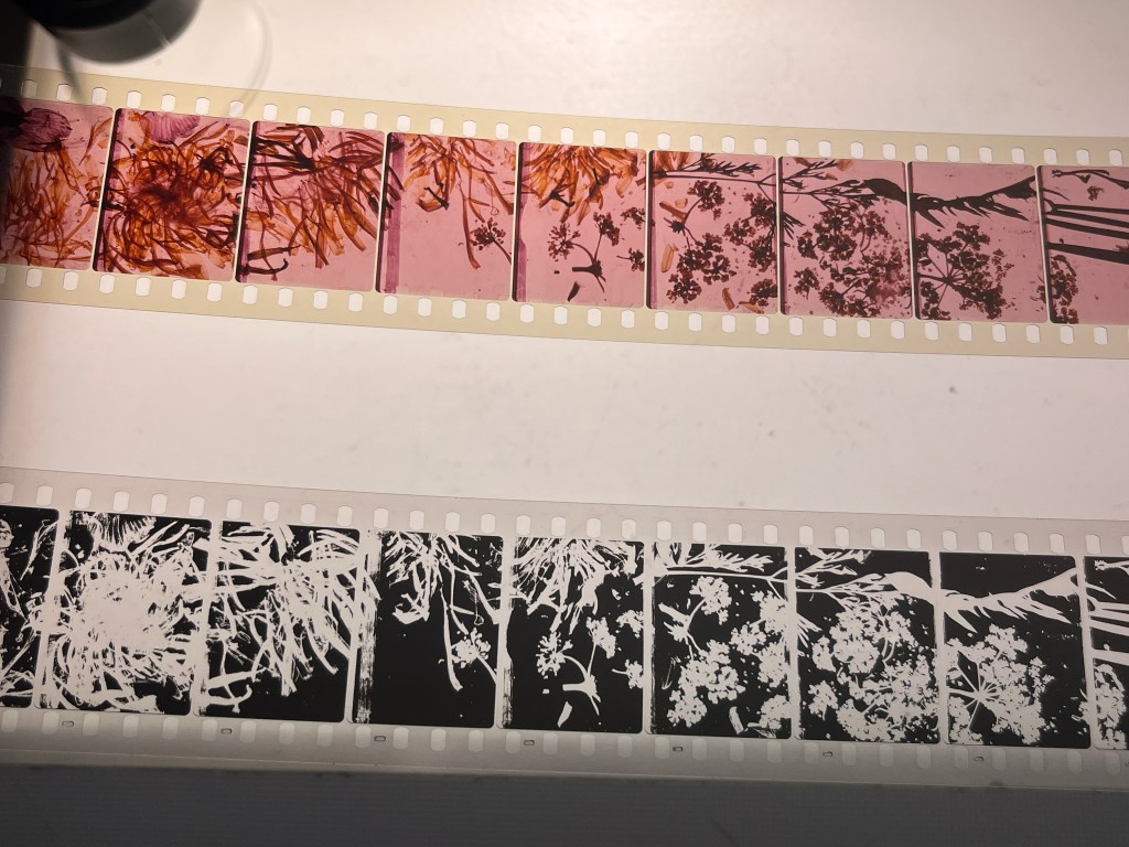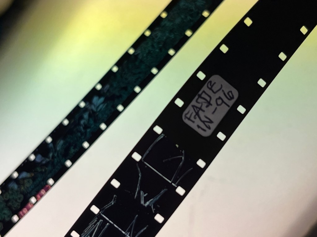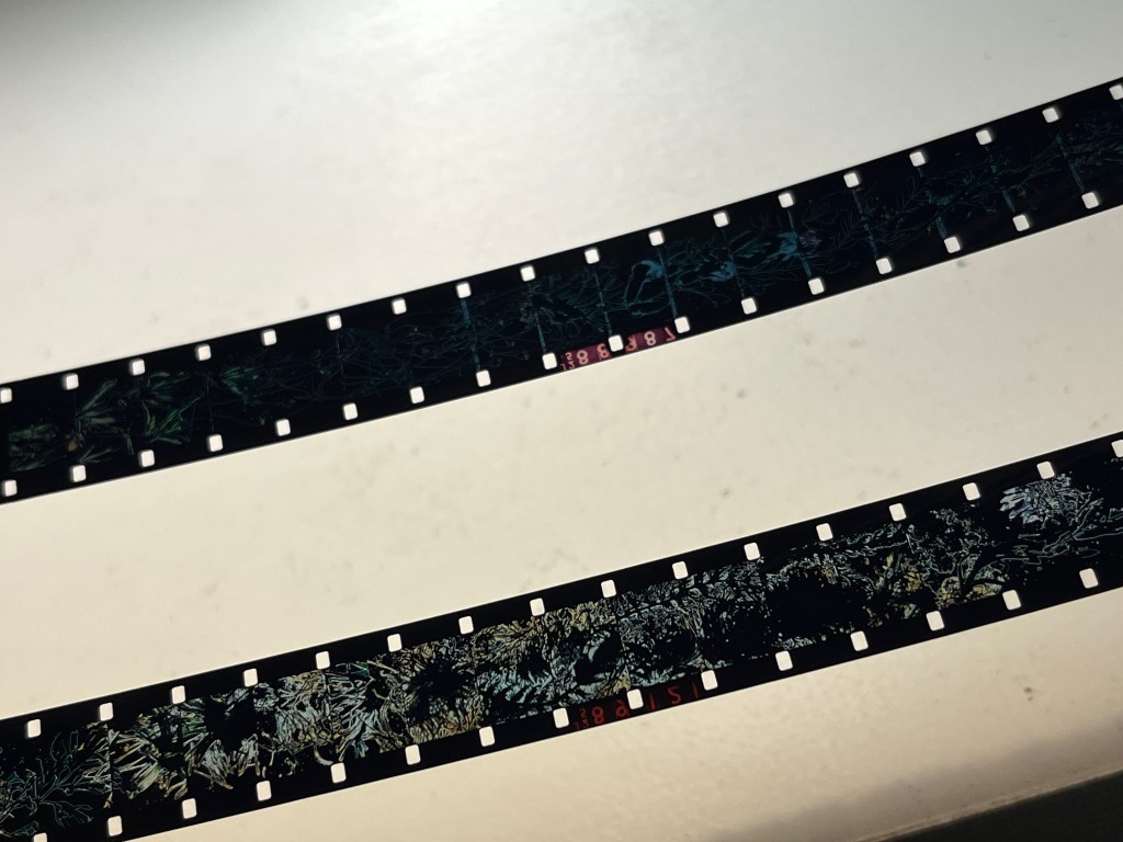 The “Garden” section of the film is relatively unmodified from the production material’s original visual appearance. The 660-frame sequence of organic material was first duplicated on the optical printer to 5247 color negative, running beginning to end, and then end back to beginning, so this first generation optical negative comprises two run-throughs of the footage – one forwards, and one backwards. This optical color negative was then printed both to 35mm 5381 color print stock, AND optically reduced to 16mm 7381 color print stock. I’ll come back to this later.
