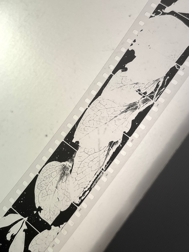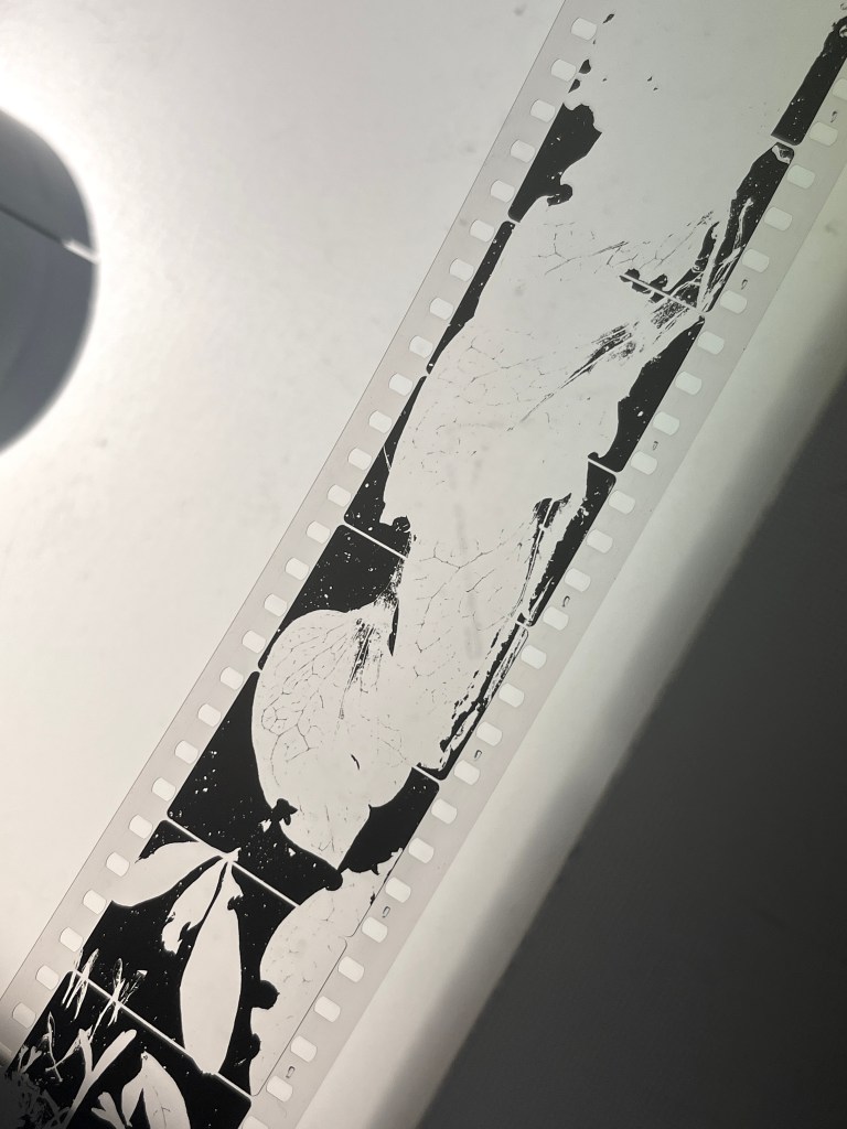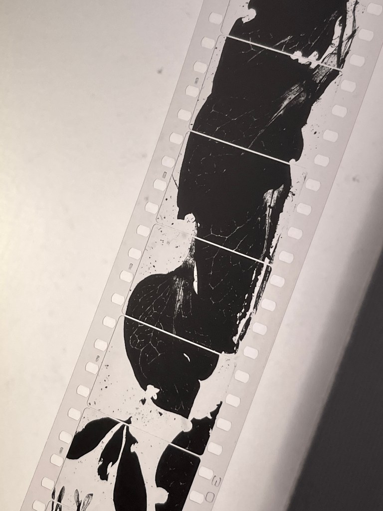 At this point, a 16mm reduction print test seems to have been produced by bi-pack printing the color print with the newly created hicon matte, but the results were deemed partly unsatisfactory by Brakhage, seemingly mostly due to issues with color. Based on his response, the lab seems to have had the feeling that the hicon matte needed to be printed another couple of generations to clear out some of the visible density still remaining in its highlights (a notation on the lab paperwork explains that “Brakhage – need wider variety of color / too green (whites) / need 2 more matte generations to clear out”). To hopefully achieve a more desirable result, this hicon negative was itself printed to 35mm 5369 hicon positive, and this positive printed AGAIN to make a 3rd generation 35mm 5369 hicon negative, which was deemed a more successful result. Here are pictures of these three generations of 5369 hicon mattes. The first picture is of the 1st generation negative matte, the 2nd is the 2nd generation positive matte, and the 3rd is the 3rd generation negative matte. In comparing the two negative mattes, you can particularly see how the extra two generations gave a more “cleared out” result in the whites, to allow for more effective and vivid windowing of the color image in the bi-pack: