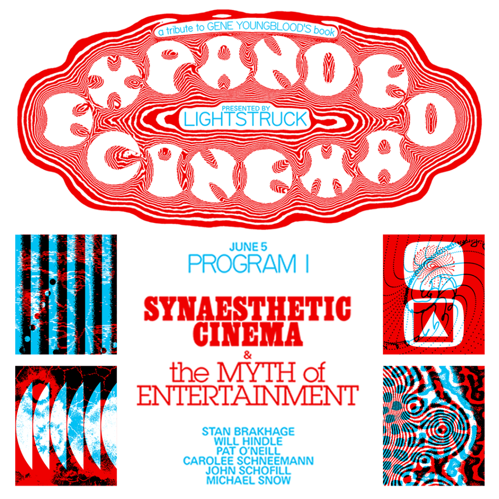 With the volatile debates and growing concerns about the role technology has come to play in our psychic and social health affecting so many of us, Gene Youngblood’s more optimistic, semi-utopian conceptions are well worth revisiting. One thing is clear: collective community experience of art/media/performance has more value than ever in a fragmented and destabilized culture. In tribute to this massively influential and still-riveting book, Lightstruck has curated three full programs of films discussed in Expanded Cinema, most of them rarely screened and many showing in beautiful 16mm prints.